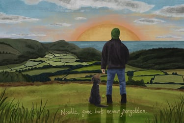 Our personalised pet illustrations capture your pet within a meaningful location, turning a favourite place into a lasting illustration.
