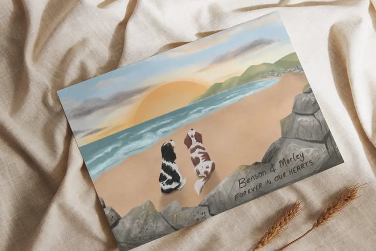 For those remembering a pet no longer with them, these illustrations can be a comforting way to honour their happy place where memories live on.